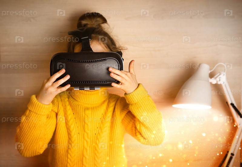 Девушка в очках виртуальной реальности сидит возле лампы с волшебным светом. Желтый свитер, технологии и развитие детей