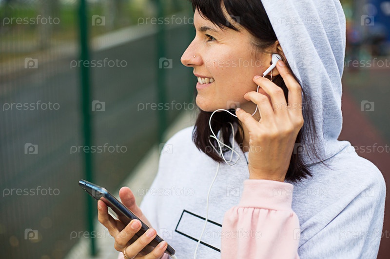 Кавказская женщина пользуется смартфоном через проводные наушники с гарнитурой. Телефон в руке, белый кабель в ухе, лейбл Enjoy на толстовке. Слушайте музыку через гаджет, спорт в приложении. Место для текста