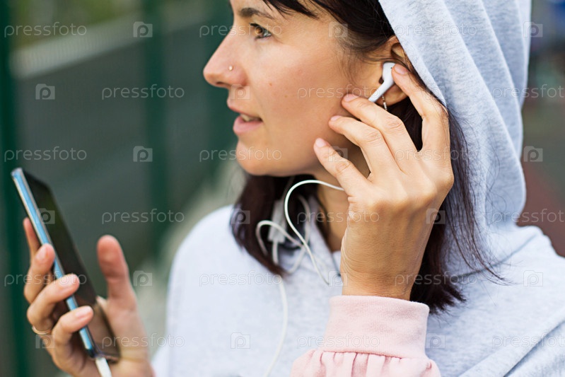Кавказская женщина пользуется смартфоном через проводные наушники с гарнитурой. Телефон в руке, белый кабель в ухе, лейбл Enjoy на толстовке. Слушайте музыку через гаджет, спорт в приложении. Место для текста