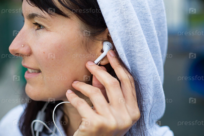 Кавказская женщина пользуется смартфоном через проводные наушники с гарнитурой. Телефон в руке, белый кабель в ухе, лейбл Enjoy на толстовке. Слушайте музыку через гаджет, спорт в приложении. Место для текста