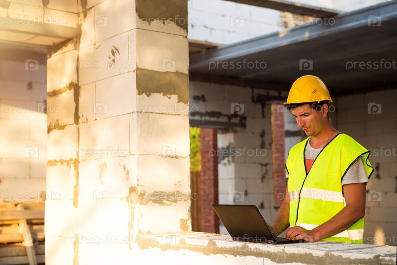 Инженер-строитель на строительной площадке дома из пористых бетонных блоков работает за компьютером в светоотражающем жилете и каске. Дизайн, строительство, чертежи проекта, проверка