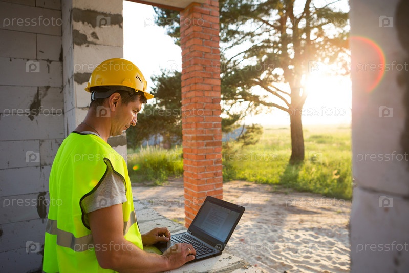 Инженер-строитель на строительной площадке дома из пористых бетонных блоков работает за компьютером в светоотражающем жилете и каске. Дизайн, строительство, чертежи проекта, проверка