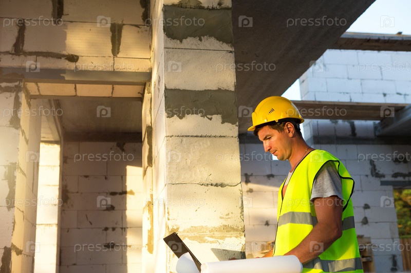 Инженер-строитель на строительной площадке дома из пористых бетонных блоков работает за компьютером в светоотражающем жилете и каске. Дизайн, строительство, чертежи проекта, проверка