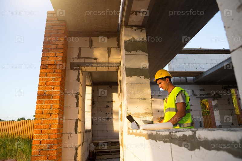 Инженер-строитель на строительной площадке дома из пористых бетонных блоков работает за компьютером в светоотражающем жилете и каске. Дизайн, строительство, чертежи проекта, проверка