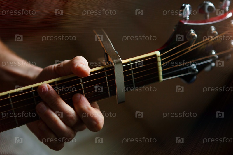 Рука мужчины на грифе гитары проводит пальцами по струнам и зажимает аккорды. Инструментальная музыка, урок игры на гитаре на нотах