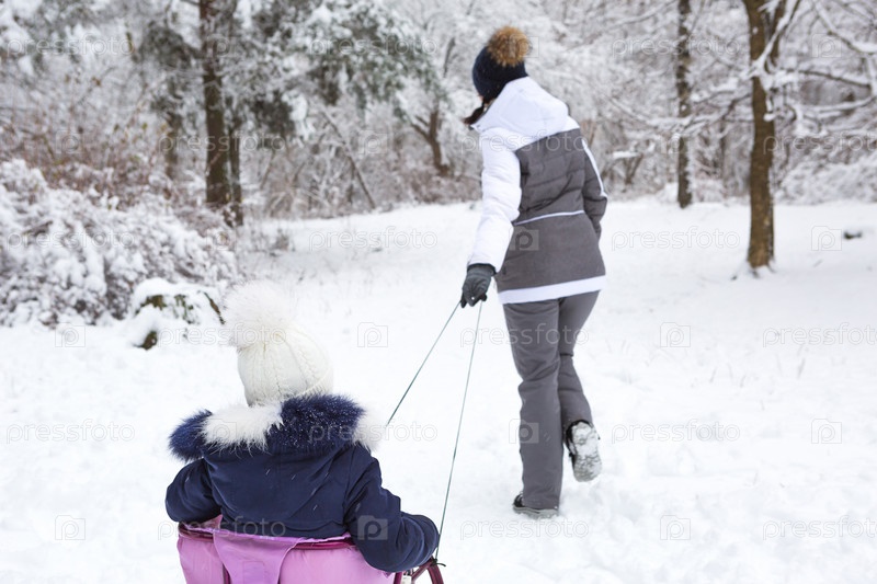 Мама везет свою маленькую дочь на санках в гору по зимнему снежному лесу. Активный семейный отдых на свежем воздухе