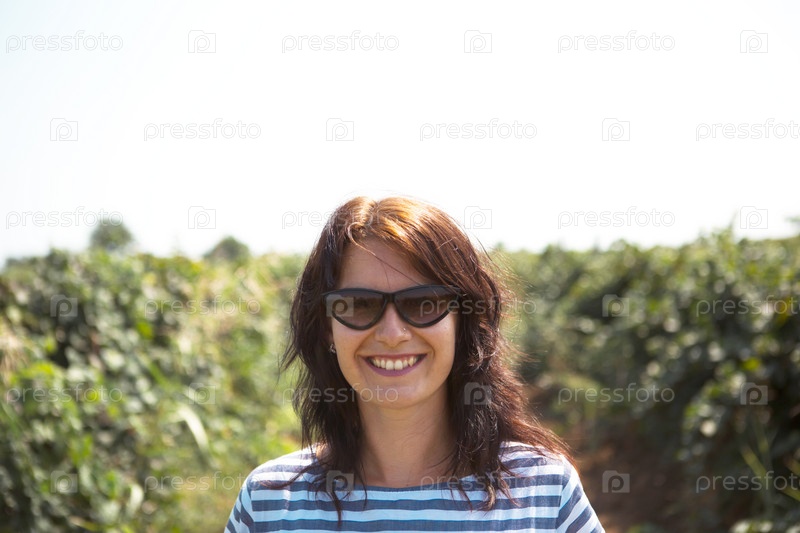 Туристка гуляет по винограднику. Экскурсия по виноградной плантации