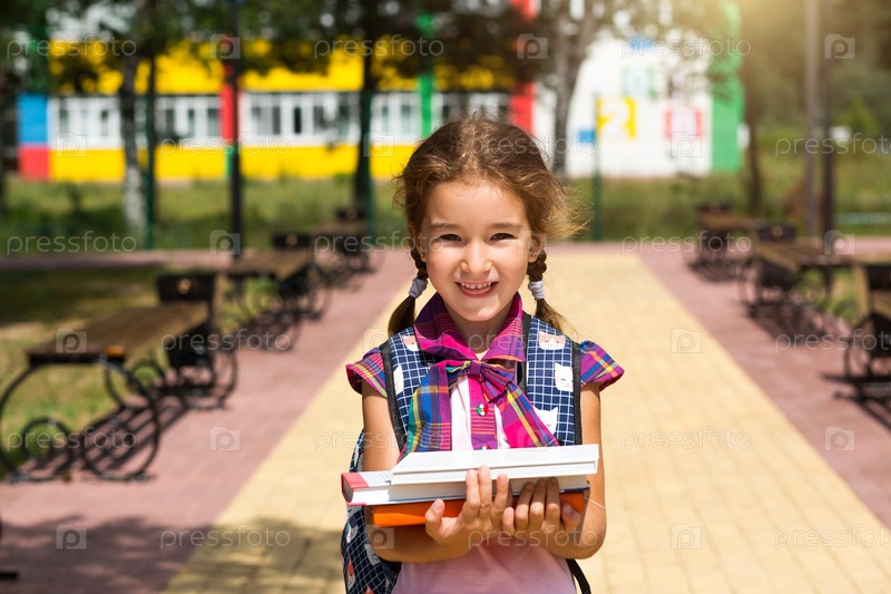 Девушка с рюкзаком и стопкой книг возле школы. Снова в школу, счастливый ученик, тяжелые учебники. Образование, начальные классы, начало учебного года, 1 сентября