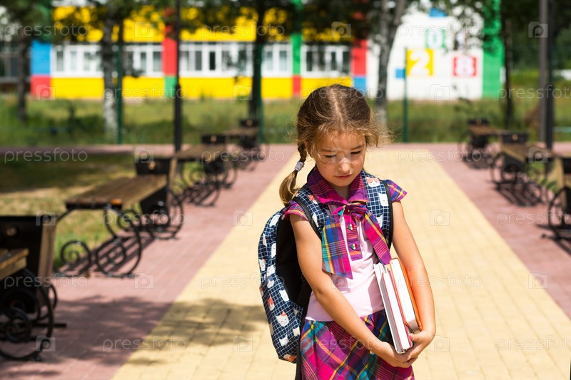 Девушка с рюкзаком и стопкой книг возле школы. Снова в школу, ребенок устал, тяжелые учебники. Образование, начальные классы, начало учебного года, 1 сентября