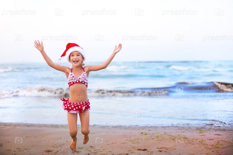 5-летняя девочка в красном купальнике и шляпе Санты на пляже счастлива, кричит, прыгает и машет руками от счастья. Рождественские и новогодние зимние туры в теплые страны. Туризм для отдыха в тропиках