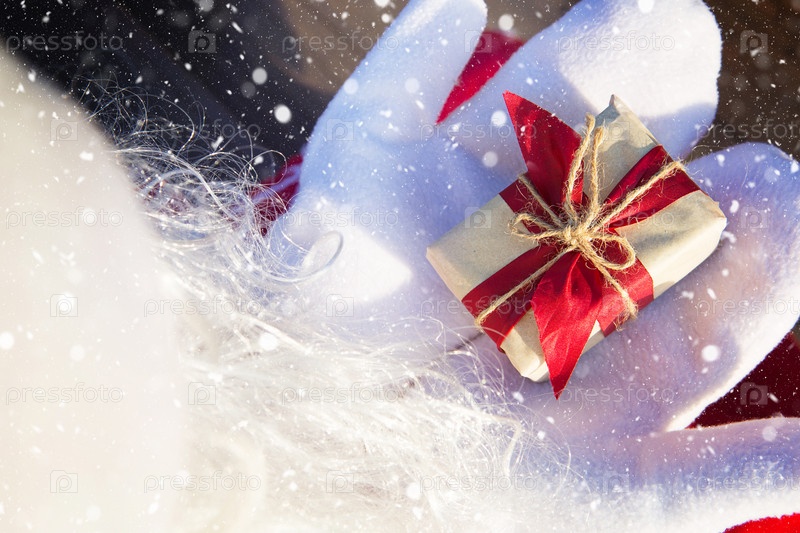 Коробка с рождественским подарком в руках Деда Мороза в белых варежках. Красный костюм, борода, гирлянды в размытом свете. Новый год, подготовка, ожидание чуда, сбывшаяся мечта. Крупным планом