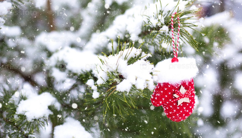 Красная рождественская игрушка вязала варежки на ветке натуральной ели, покрытой снегом. Новый год на открытом воздухе. Снегопад, гирлянды, праздничное настроение сказок и волшебства, убранство улиц. Копировать пространство