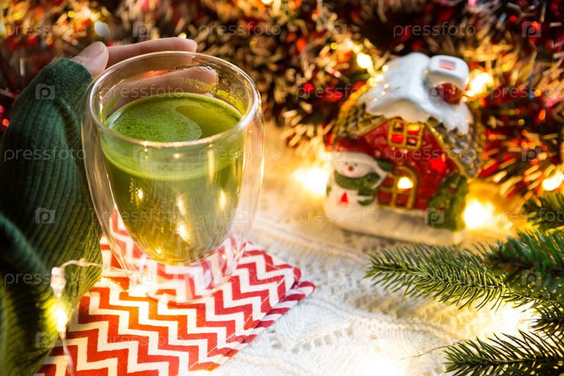 Женская рука держит стеклянный стакан с двойными стенками и японским чаем маття на столе с рождественским декором. Новогодняя атмосфера, гирлянда и мишура, еловая ветка, уют, вязаное одеяло, полосатая салфетка
