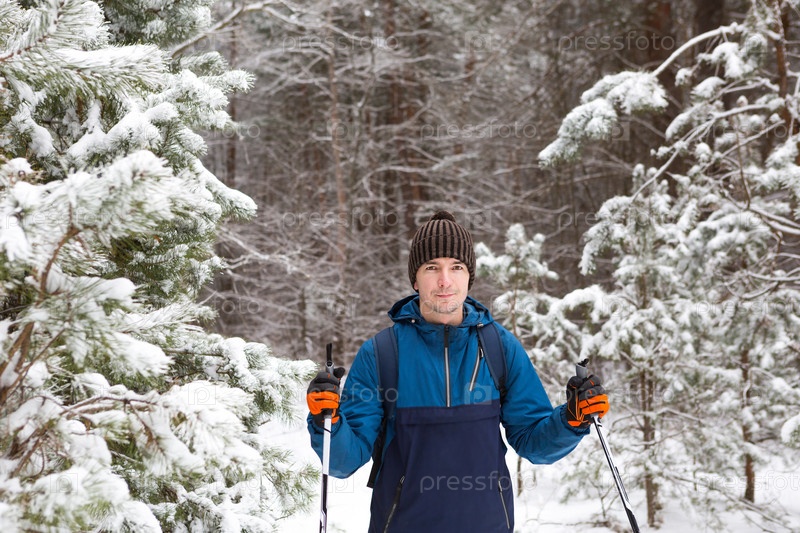 Лыжник с рюкзаком и шляпой с помпоном с лыжными палками в руках на фоне заснеженного леса. Лыжные гонки в зимнем лесу, спорт на открытом воздухе, здоровый образ жизни, зимний спортивный туризм