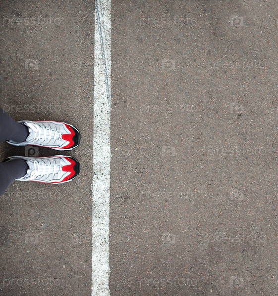 Ноги в кроссовках стоят возле разделительной линии на асфальте. Ограничительная линия, социальная дистанция, ожидание в очереди. Граница, встаньте в очередь для начала. Копировать пространство