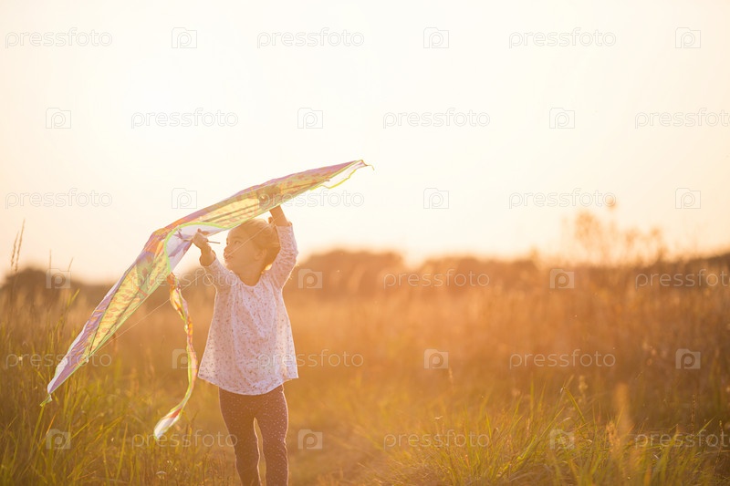 Девушка выбегает в поле с воздушным змеем, учится его запускать. Отдых на свежем воздухе летом, природа и свежий воздух. Детство, свобода и беззаботность. Ребенок с крыльями — это мечта и надежда