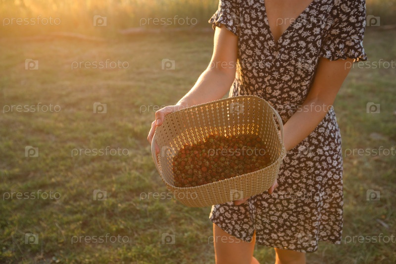 Свежие спелые красные ягоды земляники в корзине в руках женщины в летнем платье в сельской местности на солнце. Дары природы, витамины лета, сбор ягод, урожай
