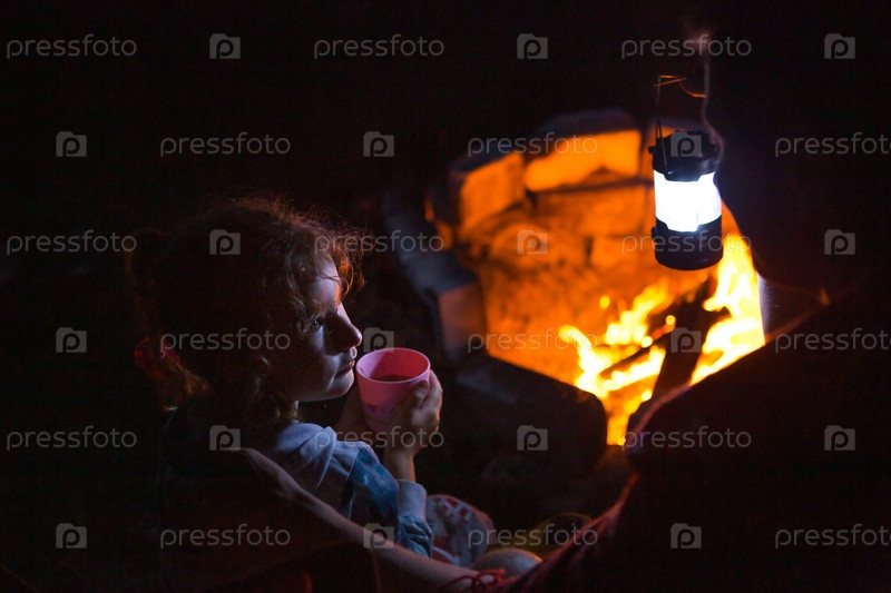 Папа и дочь сидят ночью у костра на открытом воздухе летом на природе. Семейный поход, посиделки у костра. День отца, барбекю. Кемпинговый фонарь и палатка