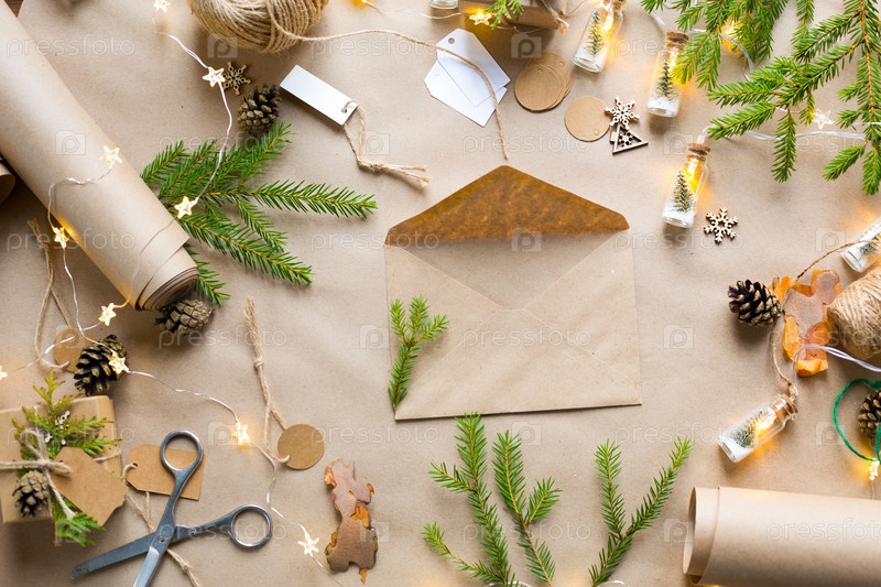 Конверт с поздравлениями на Новый год и Рождество из экологически чистых материалов: крафт-бумага, живые еловые ветки, шишки, шпагат. Теги макет, натуральный декор, ручная работа. Письмо для Деда Мороза. категорически