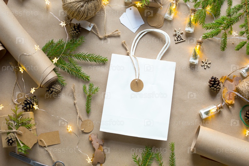 Подарочная упаковка к Рождеству и Новому году из экологически чистых материалов: крафт-бумага, живые еловые ветки, шишки, шпагат. Теги с макетом, натуральный декор, ручная работа, сделай сам. Скопируйте пространство. Плоско, фон
