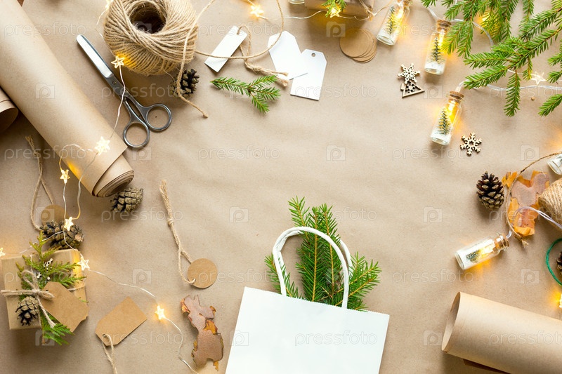 Подарочная упаковка к Рождеству и Новому году из экологически чистых материалов: крафт-бумага, живые еловые ветки, шишки, шпагат. Теги с макетом, натуральный декор, ручная работа, сделай сам. Скопируйте пространство. Плоско, фон