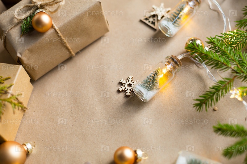 Фон с копирайтом на Рождество и новый год из экологически чистых материалов: крафт-бумага, подарочная коробка, живые еловые ветки, шишки, шпагат. Теги с макетом, натуральный декор, ручная работа, сделай сам. категорически