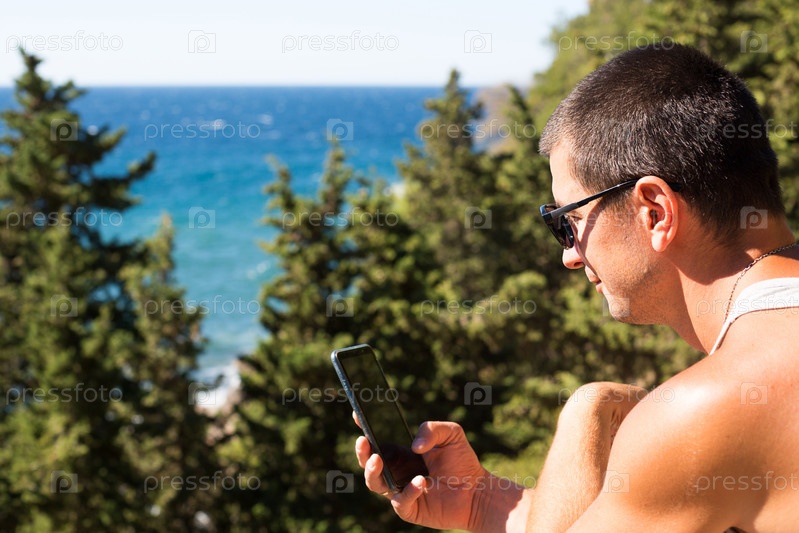 Турист-мужчина фотографирует на смартфон прекрасный вид на море в гористой местности сверху среди хвойных деревьев. Видеосвязь, использование телефона в путешествии. Сим-карта в роуминге