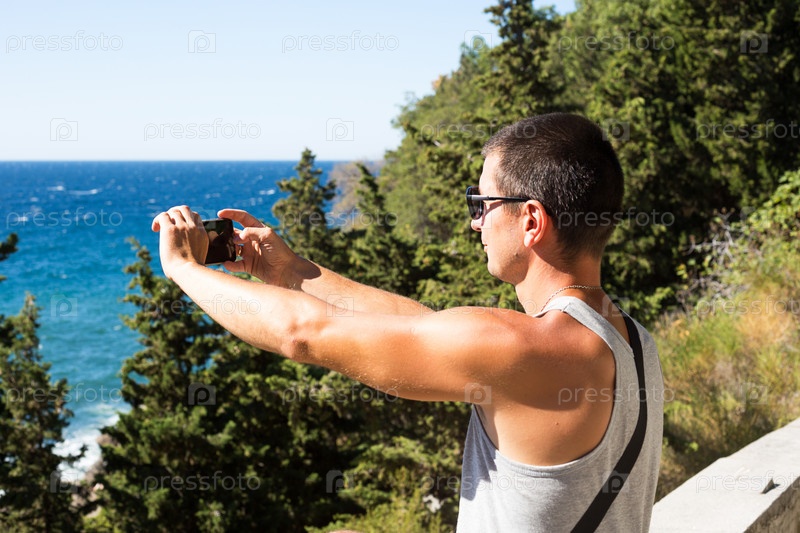 Турист-мужчина фотографирует на смартфон прекрасный вид на море в гористой местности сверху среди хвойных деревьев. Видеосвязь, использование телефона в путешествии. Сим-карта в роуминге