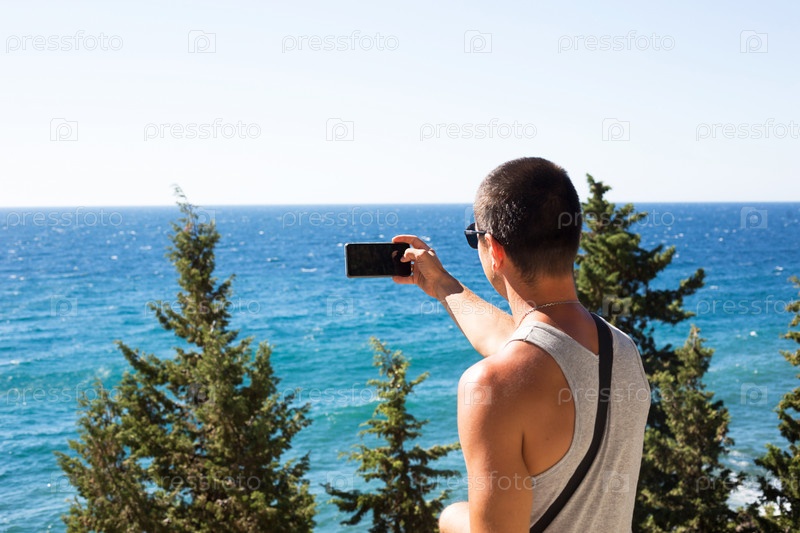 Турист-мужчина фотографирует на смартфон прекрасный вид на море в гористой местности сверху среди хвойных деревьев. Видеосвязь, использование телефона в путешествии. Сим-карта в роуминге