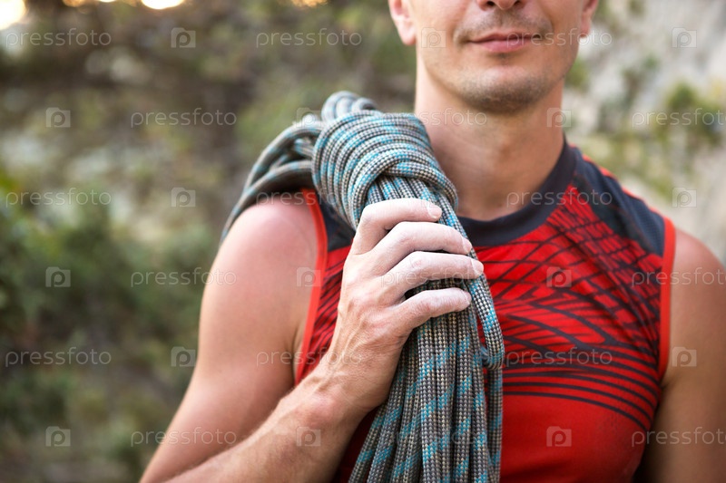 Мужчина-альпинист кавказской внешности со свернутой веревкой в руке. Намотка каната, узел, хранение снаряжения. Рука в белой магнезии. Красный спортивный трикотаж, экстрим, скалолазание. образ жизни