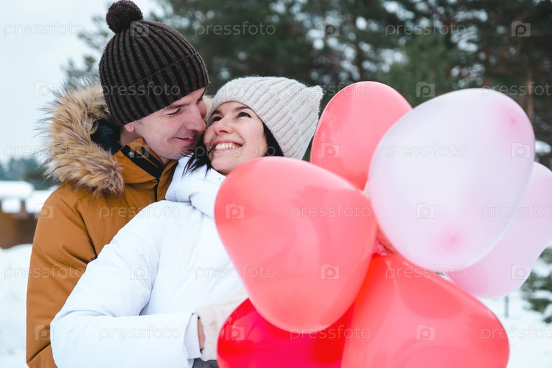 Влюбленные мужчина и женщина на свидании на свежем воздухе зимой в снегу с подарком розовых и красных воздушных шаров в форме сердца. День святого Валентина, любовь, счастливая влюбленная пара на прогулке