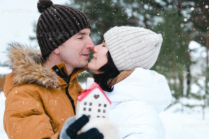 Мужчина и женщина в любви на открытом воздухе зимой с символом дома и любви. День святого Валентина, счастливая пара, история любви. Влюбленное гнездышко, ипотека, переезд, покупка, недвижимость, жилье для молодой семьи