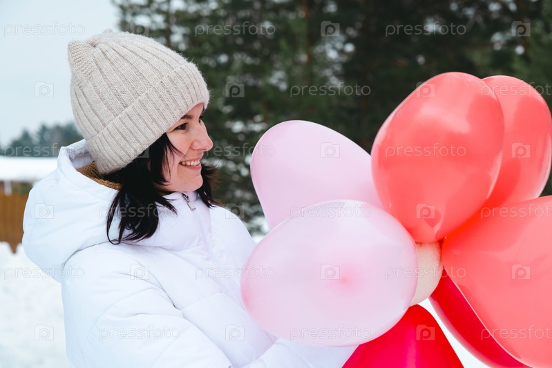 Счастливая женщина с воздушными шарами в форме сердца на открытом воздухе зимой со снегом. День святого Валентина, любовь и увлечение, подарок от парня, признание в любви, образ жизни