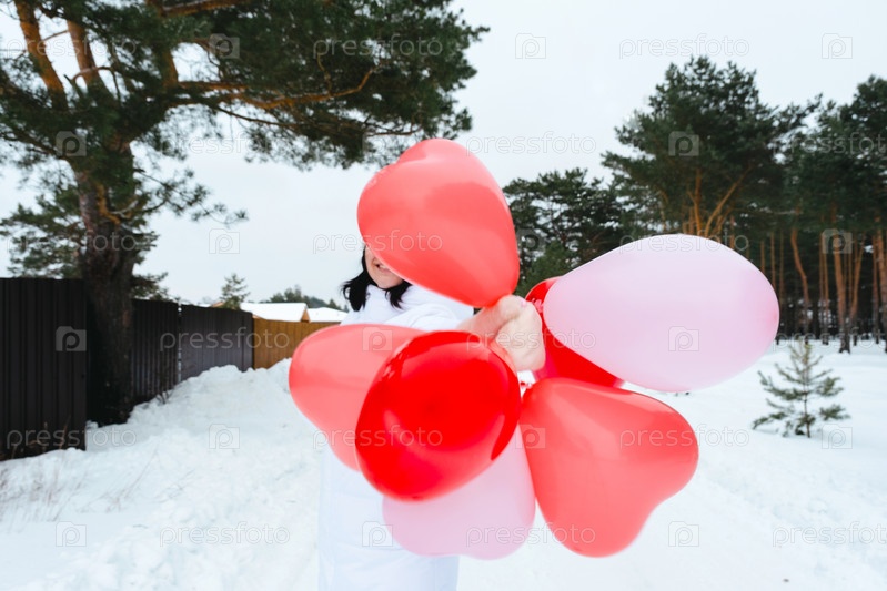 Счастливая женщина без лица с воздушными шарами в форме сердца на открытом воздухе зимой со снегом. День святого Валентина, любовь и увлечение, подарок от парня, признание в любви, образ жизни