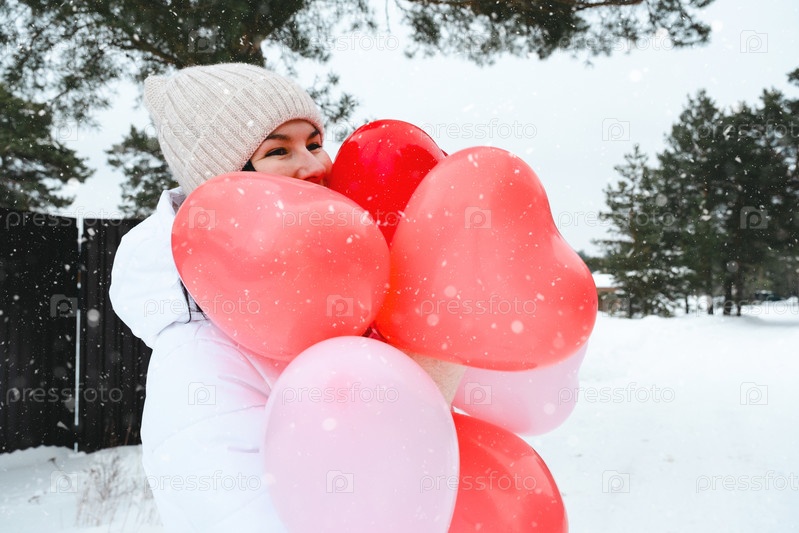 Счастливая женщина с воздушными шарами в форме сердца на открытом воздухе зимой со снегом. День святого Валентина, любовь и увлечение, подарок от парня, признание в любви, образ жизни