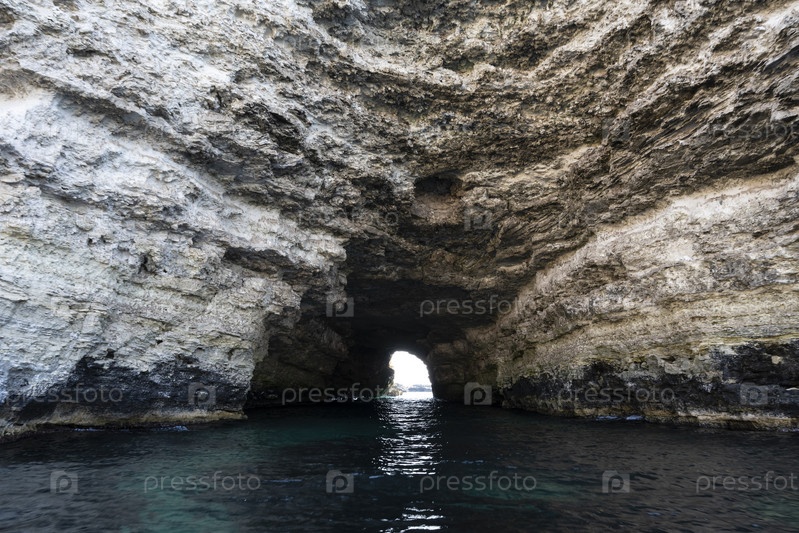 Грот в скале Тарханкутского национального природного парка, Республика Крым, Россия. Ясный солнечный день 26 сентября 2020 г
