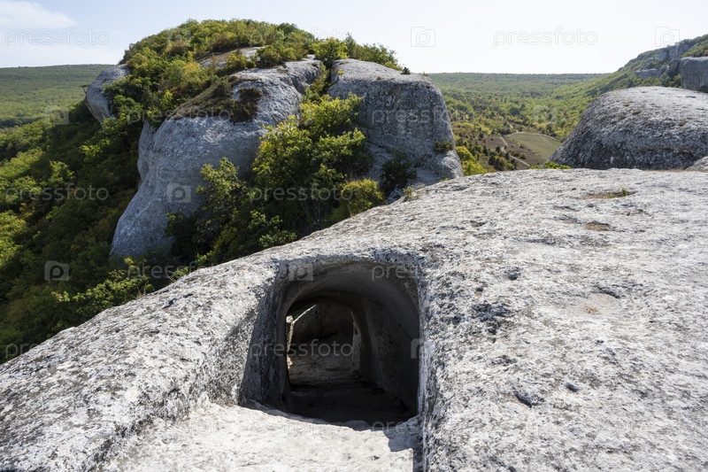 Пещерный город Эски-Кермен в Республике Крым, Россия. Ясный солнечный день 29 сентября 2020 г