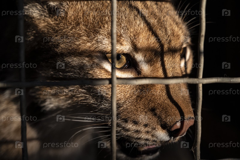 Лицо дикой кошки крупным планом в клетке