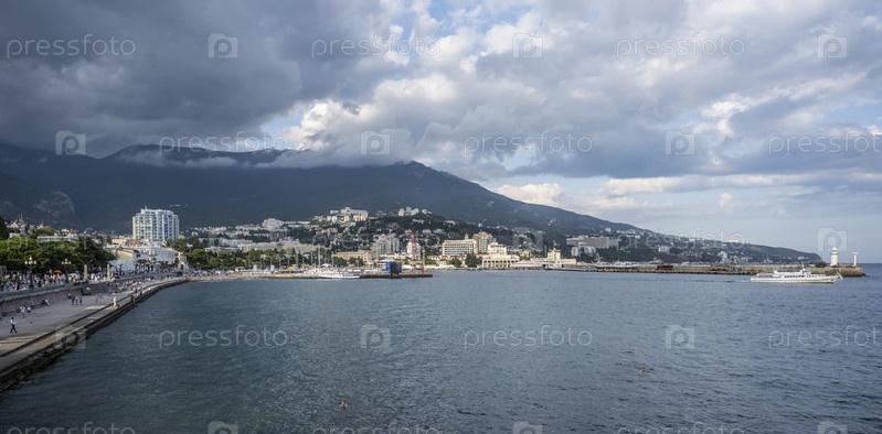 Вечерний город Ялта, горы, море и небо с облаками. Республика Крым, Россия. 7 сентября 2020 г