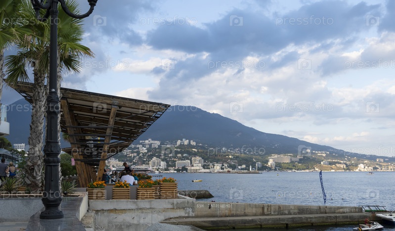 Кафе на набережной города Ялты с видом на море и горы. Республика Крым, Россия. Вечером 7 сентября 2020 г