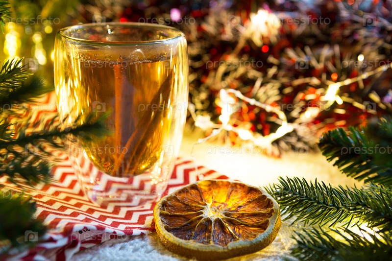 Прозрачный стеклянный стакан с двойными стенками с горячим чаем и палочками корицы на столе с рождественским декором. Новогодняя атмосфера, ломтик сушеного апельсина, гирлянда и мишура, еловая ветка, уютно