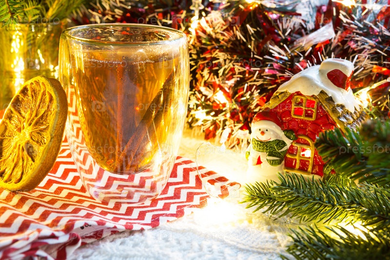 Прозрачный стеклянный стакан с двойными стенками с горячим чаем и палочками корицы на столе с рождественским декором и домиком. Новогодняя атмосфера, ломтик сушеного апельсина, гирлянда, еловая ветка, уютно