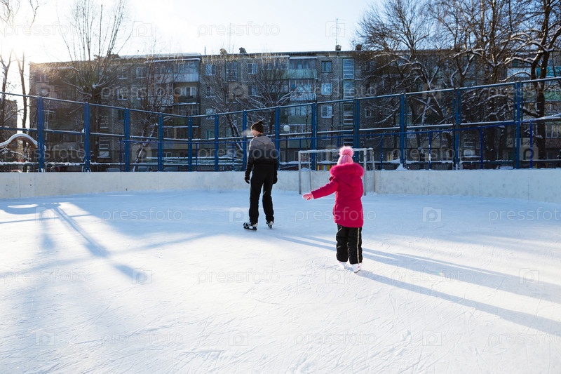 Папа учит свою маленькую дочь кататься на коньках на катке во дворе многоэтажного дома в городе. Морозный зимний солнечный день, активные зимние виды спорта и образ жизни
