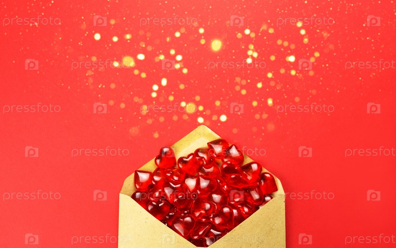 Стеклянные сердца выплескиваются из открытого конверта на красном фоне. День святого Валентина, любовное письмо, признание в любви, знакомство. Скопируйте пространство, макет