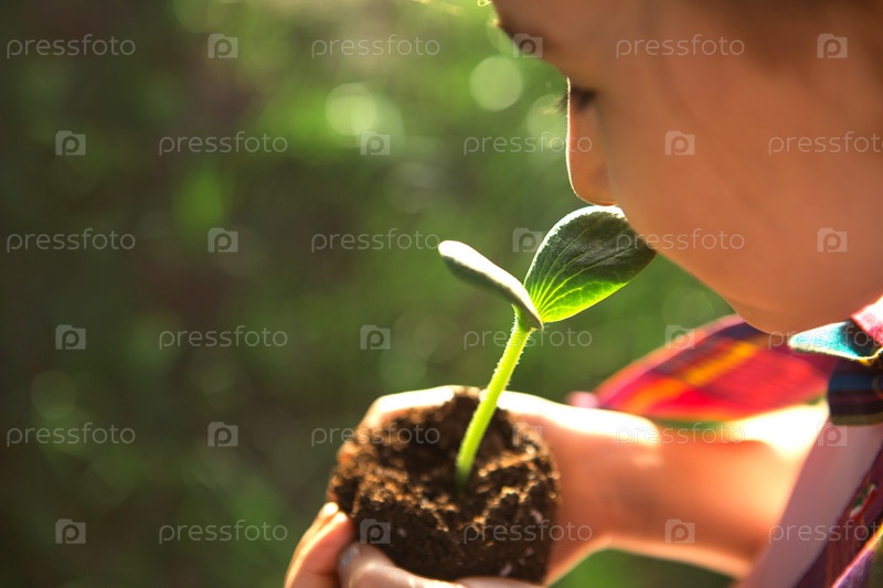 Молодой зеленый росток в руках ребенка в свете солнца на фоне зеленой травы. Натуральные саженцы, экологичность, новая жизнь, молодость. Концепция развития, мира, заботы. Копировать пространство