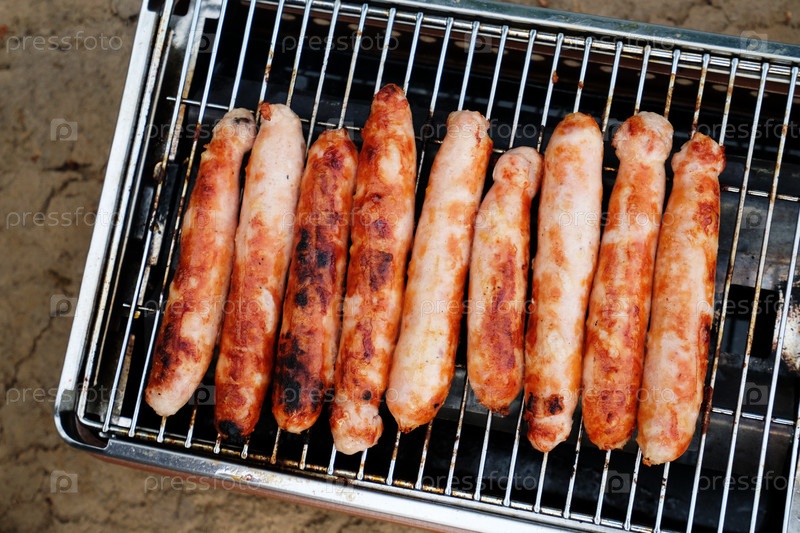 Колбасы, запеченные на решетке газового гриля, вид сверху крупным планом. Барбекю, пикник. Еда барбекю