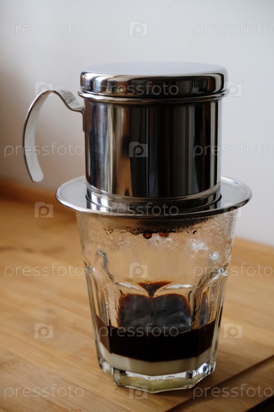 Приготовление кофе во вьетнамском фине со сгущенкой в стакане