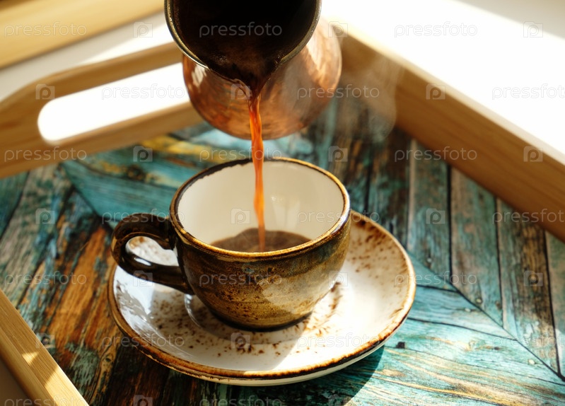 Горячий турецкий кофе льется из турки в керамическую чашку эспрессо на блюдце. Дневной свет, тени. Бирюзовый деревянный поднос