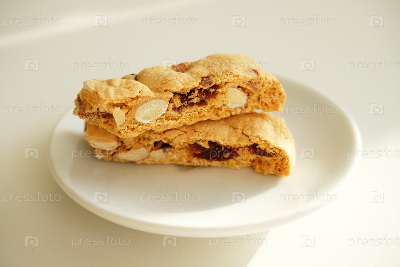 Кантуччи наклеивает печенье с цукатами и орехами на белую тарелку. белый фон