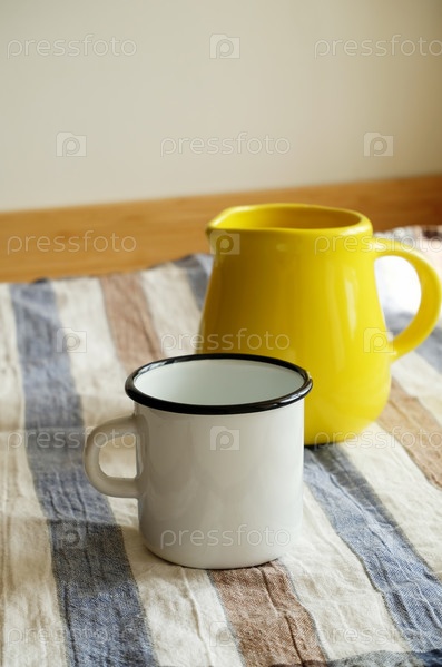 Белая эмалированная кружка и желтый керамический кувшин на льняной полосатой скатерти. Эстетика пасторального стиля. Простор для дизайна
